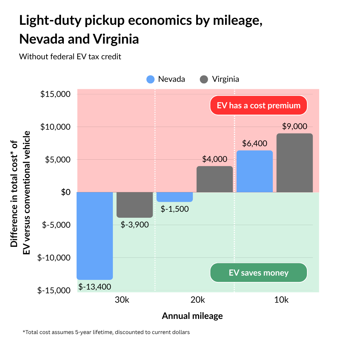Take two fleets of F-150s—one operating in Nevada, the other in Virginia. Each fleet includes vehicles driving approximately 10-30K miles per year. Using CO2-AIM, we compared the cost of new EVs to their conventional alternatives, excluding the federal EV credit (see chart below).
